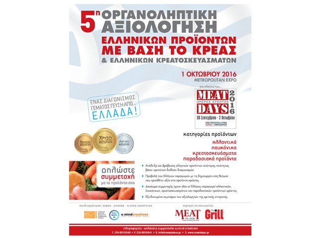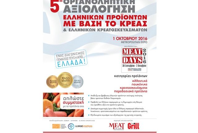 Η καθιερωμένη Οργανοληπτική Αξιολόγηση Ελληνικών Προϊόντων με βάση το κρέας θα διεξαχθεί το Σάββατο 1 Οκτωβρίου 2016, από τις 11.00 έως και τις 15.00.