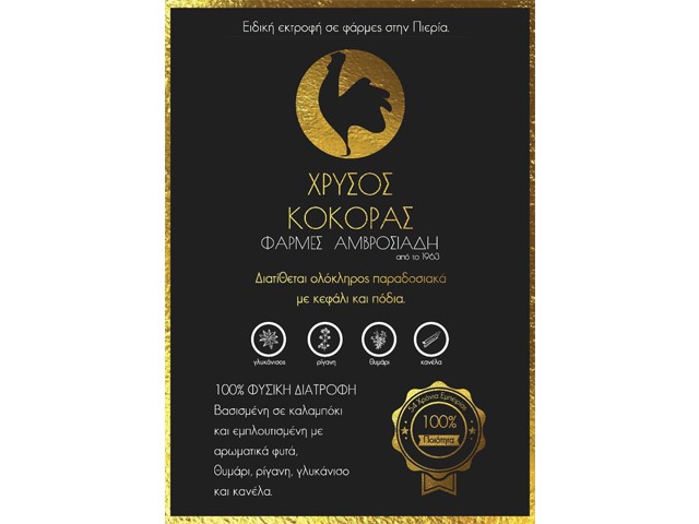 Ο «χρυσός κόκορας» εκτρέφεται στις ιδιόκτητες φάρμες Αμβροσιάδη στην Πιερία, με τα φυσικά προϊόντα της μάνας γης. Πρόκειται για μια εκτροφή με ειδική διατροφή βασισμένη στο καλαμπόκι και στα αρωματικά φυτά: θυμάρι, ρίγανη, γλυκάνισο και κανέλα.