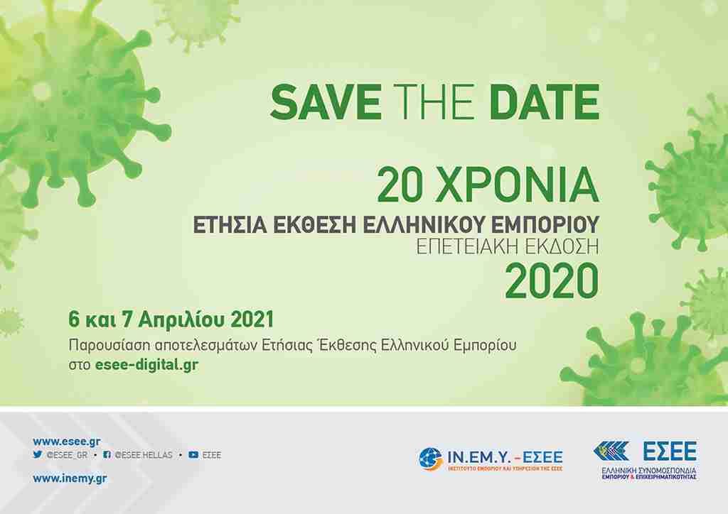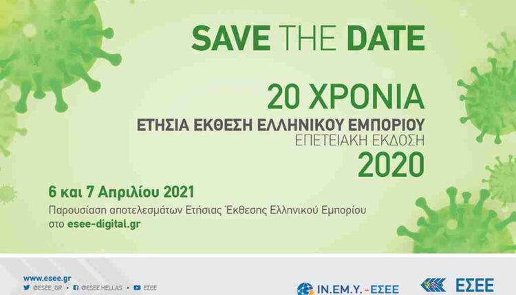 Την Τρίτη 6 και την Τετάρτη 7 Απριλίου 2021, η Ελληνική Συνομοσπονδία Εμπορίου και Επιχειρηματικότητας διοργανώνει την διαδικτυακή, επετειακή παρουσίαση της Ετήσιας Έκθεσης Ελληνικού Εμπορίου 2020.