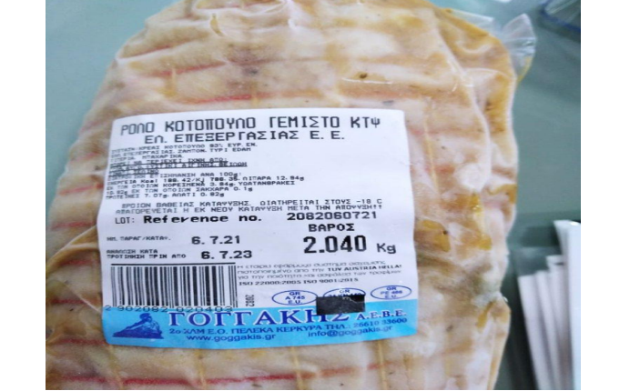 Α) «Ρολό κοτόπουλο γεμιστό κτψ, Ελλην. Επεξεργασίας», με ημερομηνία παραγωγής 6.7.21 και ημερομηνία ανάλωσης «κατά προτίμηση πριν από 6/7/23», βάρους 2 kg περίπου.