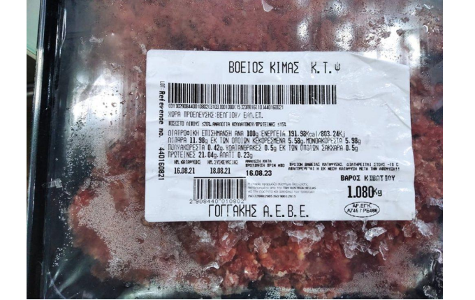 Β) «Βόειος κιμάς κτψ, προέλευσης Βελγίου, Ελλην. επεξεργασίας», με ημερομηνία συσκευασίας 18/8/21 και ημερομηνία ανάλωσης «κατά προτίμηση πριν από 16/8/23», βάρους 1 kg περίπου.