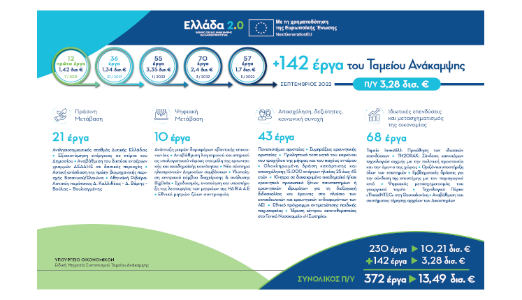 Στα 230 έργα, που είχαν ανακοινωθεί έως τον Μάιο του 2022, προστέθηκαν ακόμη 142 έργα, συνολικού προϋπολογισμού 3,28 δισ. ευρώ, τα οποία εντάχθηκαν στο «Ελλάδα 2.0», με αποφάσεις που υπέγραψε ο αρμόδιος για την υλοποίησή του, Αναπληρωτής υπουργός Οικονομικών, Θόδωρος Σκυλακάκης.