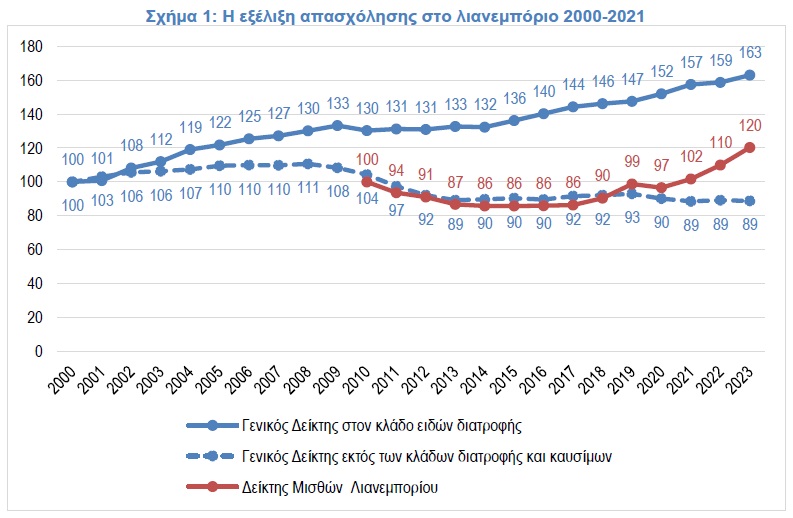 Συγκεκριμένα, από την επεξεργασία των στοιχείων απασχόλησης που παρέχει σε τριμηνιαία βάση η ΕΛΣΤΑΤ προκύπτει ότι την περίοδο 2000-2023 το λιανεμπόριο τροφίμων παρουσιάζει αύξηση της απασχόλησης κατά 63%, σε αντίθεση με το υπόλοιπο λιανικό εμπόριο το οποίο παρουσιάζει μείωση κατά 11%. Πρακτικά, το λιανεμπόριο τροφίμων το 2023 απασχολούσε πάνω από 80 χιλ. περισσότερους εργαζόμενους σε σχέση με το 2000, ξεπερνώντας τις 222 χιλ. άμεσα απασχολούμενους.
