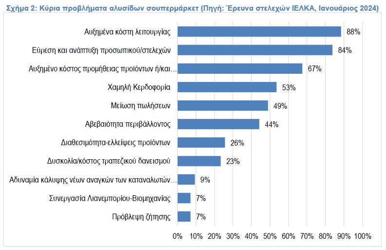 Άλλωστε όπως καταγράφεται στο σχήμα 2, τα αυξημένα κόστη λειτουργίας και η εύρεση προσωπικού αποτελούν τα δύο κυριότερα προβλήματα σήμερα για τις αλυσίδες σουπερμάρκετ στην Ελλάδα με ποσοστό 88% και 84% αντίστοιχα των στελεχών του κλάδου να τα δηλώνουν. Σύμφωνα με τα στελέχη της αγοράς ο κλάδος αναζητά (ειδικά εν όψει της θερινής περιόδου) 8.000-10.000 νέους εργαζόμενους, στην πλειοψηφία τους για το δίκτυο των καταστημάτων.