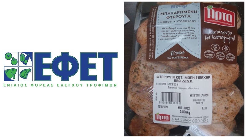 Σύμφωνα με τη σχετική ανακοίνωση, ο ΕΦΕΤ και ειδικότερα η Περιφερειακή Διεύθυνση Ηπείρου, κατά τη διενέργεια ελέγχων στο πλαίσιο του Προγράμματος «Επίσημος Έλεγχος Μικροβιολογικών Κριτηρίων Ασφάλειας Τροφίμων» έτους 2024, προέβη σε δειγματοληψία νωπού παρασκευάσματος από κρέας πουλερικών που προορίζεται να καταναλωθεί μαγειρεμένο, με την εμπορική ονομασία «ΜΠΑΧΑΡΩΜΕΝΗ ΦΤΕΡΟΥΓΑ ΝΩΠΟΥ ΚΟΤΟΠΟΥΛΟΥ ΑΡΤΑ» με αριθμό Lot 240618.12318 και ημερομηνία λήξης 18/06/2024, το οποίο παράγεται και συσκευάζεται στην Ελλάδα από την εταιρεία ΑΓΡΟΤΙΚΟΣ ΠΤΗΝΟΤΡΟΦΙΚΟΣ ΣΥΝΕΤΑΙΡΙΣΜΟΣ ΑΡΤΑΣ.
