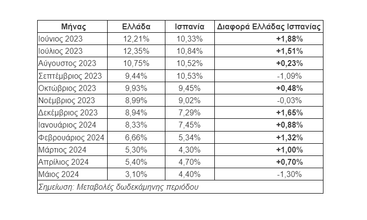 Σύμφωνα με την ΕΕΚΕ, τα πραγματικά στοιχεία του Δείκτη Food Inflation μεταξύ Ελλάδας και Ισπανίας το τελευταίο δωδεκάμηνο είναι τα εξής: