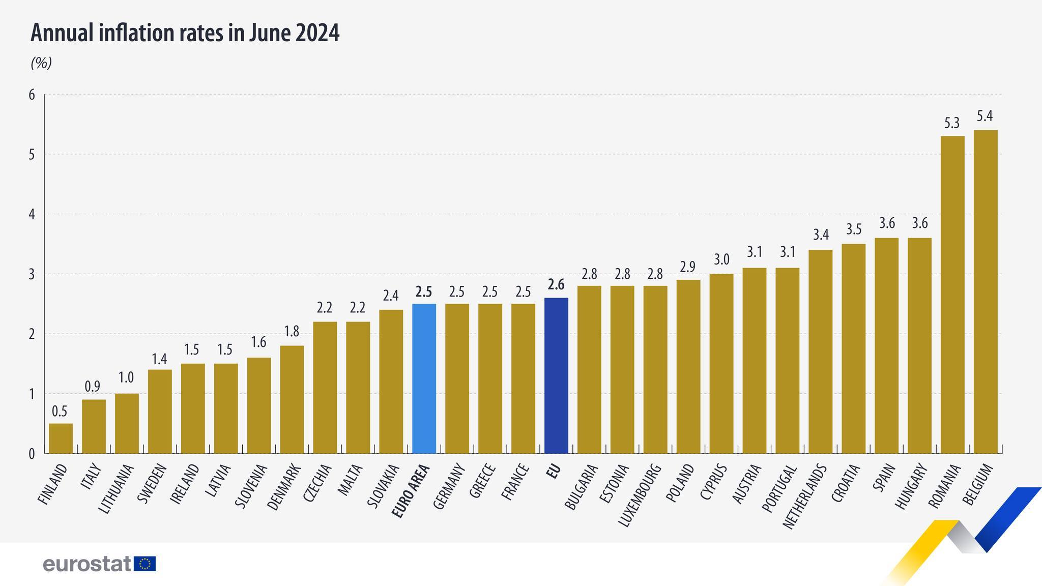 Στο 2,5% -λίγο υψηλότερα από προκαταρκτική εκτίμηση του 2,4% και παραμένοντας σε επίπεδα Μαΐου- διαμορφώθηκε τελικά ο πληθωρισμός στην Ελλάδα τον Ιούνιο, σύμφωνα με τη στατιστική υπηρεσία της Ευρωπαϊκής Ένωσης (Eurostat).