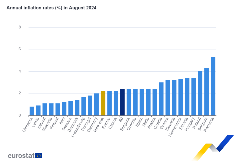 Στο 2,2% διαμορφώθηκε τον Αύγουστο του 2024 ο ετήσιος ρυθμός πληθωρισμού στην ευρωζώνη, σύμφωνα με τα στοιχεία που ανακοίνωσε η στατιστική υπηρεσία της Ευρωπαϊκής Ένωσης, Eurostat.