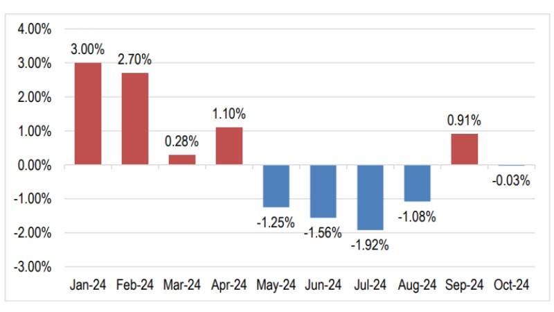 Όπως φαίνεται και στο παραπάνω γράφημα, από τις αρχές του έτους σημειώνεται άνοδος σε πέντε μήνες (Ιανουάριος, Φεβρουάριος, Μάρτιος, Απρίλιος και Σεπτέμβριος), ενώ μείωση καταγράφεται επίσης σε πέντε μήνες (Μάιος, Ιούνιος, Ιούλιος, Αύγουστος και Οκτώβριος).