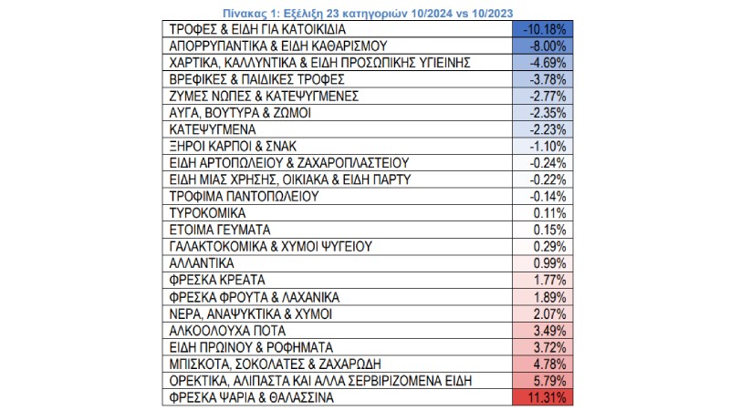 Οι τιμές των προϊόντων στα σουπερμάρκετ τον Οκτώβριο του 2024 ήταν μειωμένες κατά 0,03% (μέσος όρος) σε σχέση με τον Οκτώβριο του περασμένου έτους.