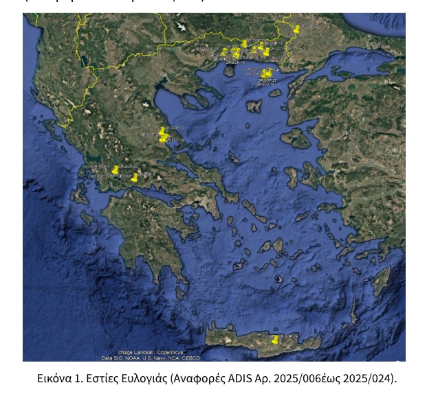 Μία εστία εντοπίζεται στην Περιφέρεια Δυτικής Ελλάδας, στην Περιφερειακή Ενότητα Αιτωλοακαρνανίας, στον Δήμο Αγρινίου (Αναφορά ADIS Αρ.2025/008).