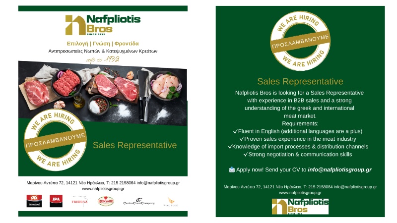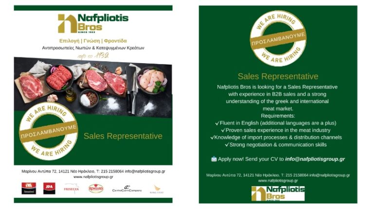 Η Nafpliotis Bros, μια από τις κορυφαίες εταιρείες στον χώρο των εισαγωγών και διανομών νωπών και κατεψυγμένων κρεάτων με παρουσία στην αγορά από το 1932, αναζητά Sales Representative με εμπειρία στις B2B πωλήσεις και γνώση της ελληνικής και διεθνούς αγοράς κρέατος.