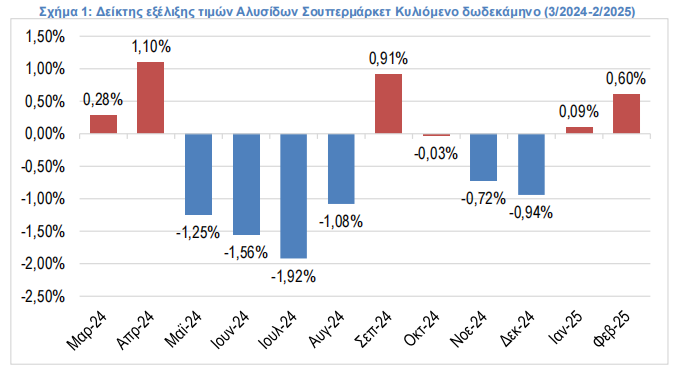 Α) Ο πληθωρισμός στις αλυσίδες σουπερμάρκετ είναι της τάξης του +0,60% τον Φεβρουάριο 2025.