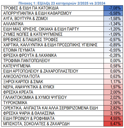 Οι μεγαλύτερες μειώσεις καταγράφηκαν στις τροφές για κατοικίδια, στα απορρυπαντικά και είδη καθαρισμού, και σε αρκετές κατηγορίες με τρόφιμα «ψυγείου» (βούτυρα, αυγά, αλλαντικά, ζύμες, έτοιμα γεύματα κ.ά.). Η κατηγορία με τρόφιμα παντοπωλείου που περιλαμβάνει το ελαιόλαδο παρουσιάζει μηδενική μεταβολή. Τα φρέσκα φρούτα και λαχανικά παρουσιάζουν μείωση -0,28%.