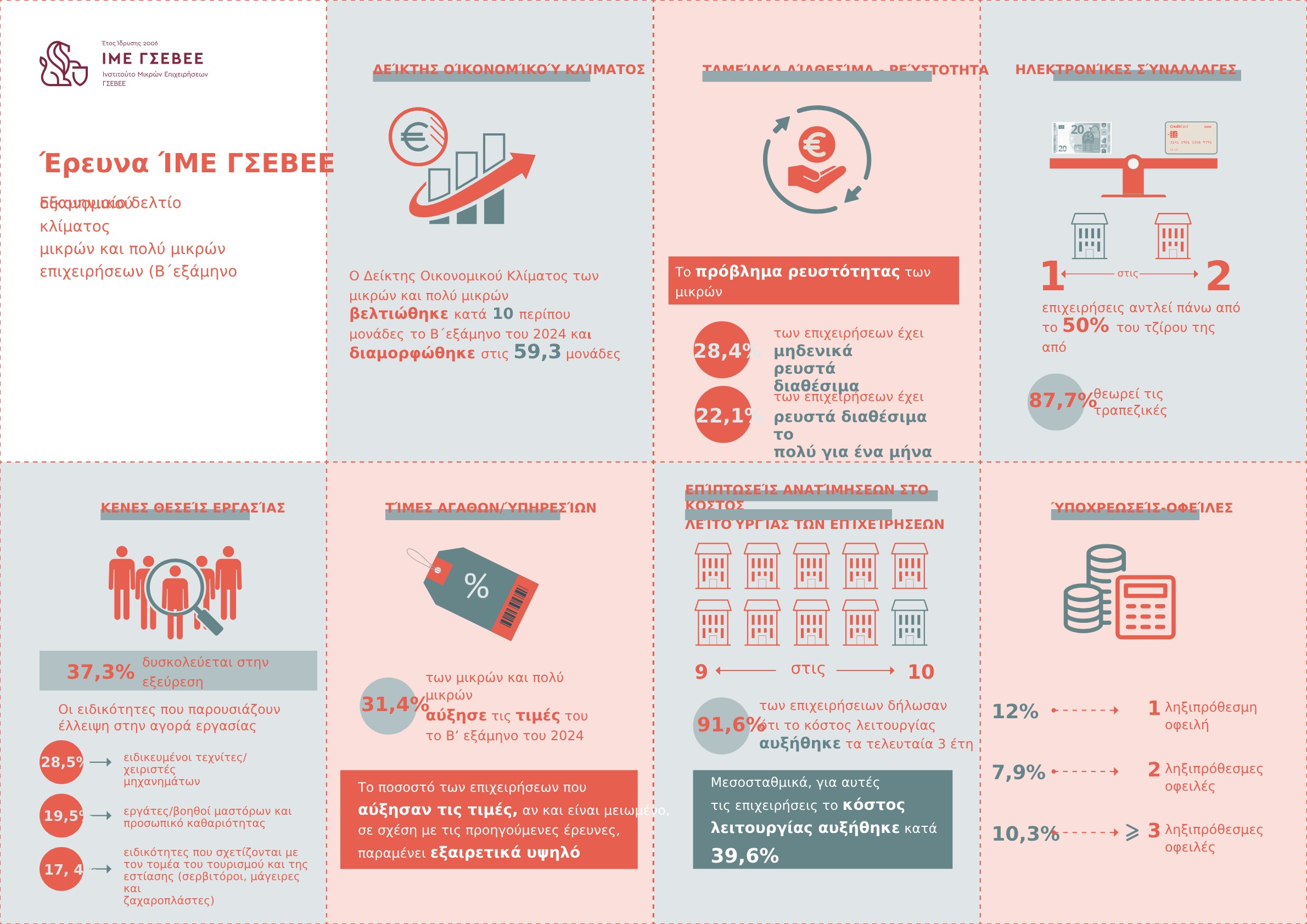 Σημαντικά βελτιωμένος εμφανίζεται για το δεύτερο εξάμηνο του 2024 ο δείκτης οικονομικού κλίματος των μικρών και πολύ μικρών επιχειρήσεων, σύμφωνα με τα ευρήματα της έρευνας του Ινστιτούτου Μικρών Επιχειρήσεων της Γενικής Συνομοσπονδίας Επαγγελματιών Βιοτεχνών Εμπόρων Ελλάδας (ΙΜΕ ΓΣΕΒΕΕ).