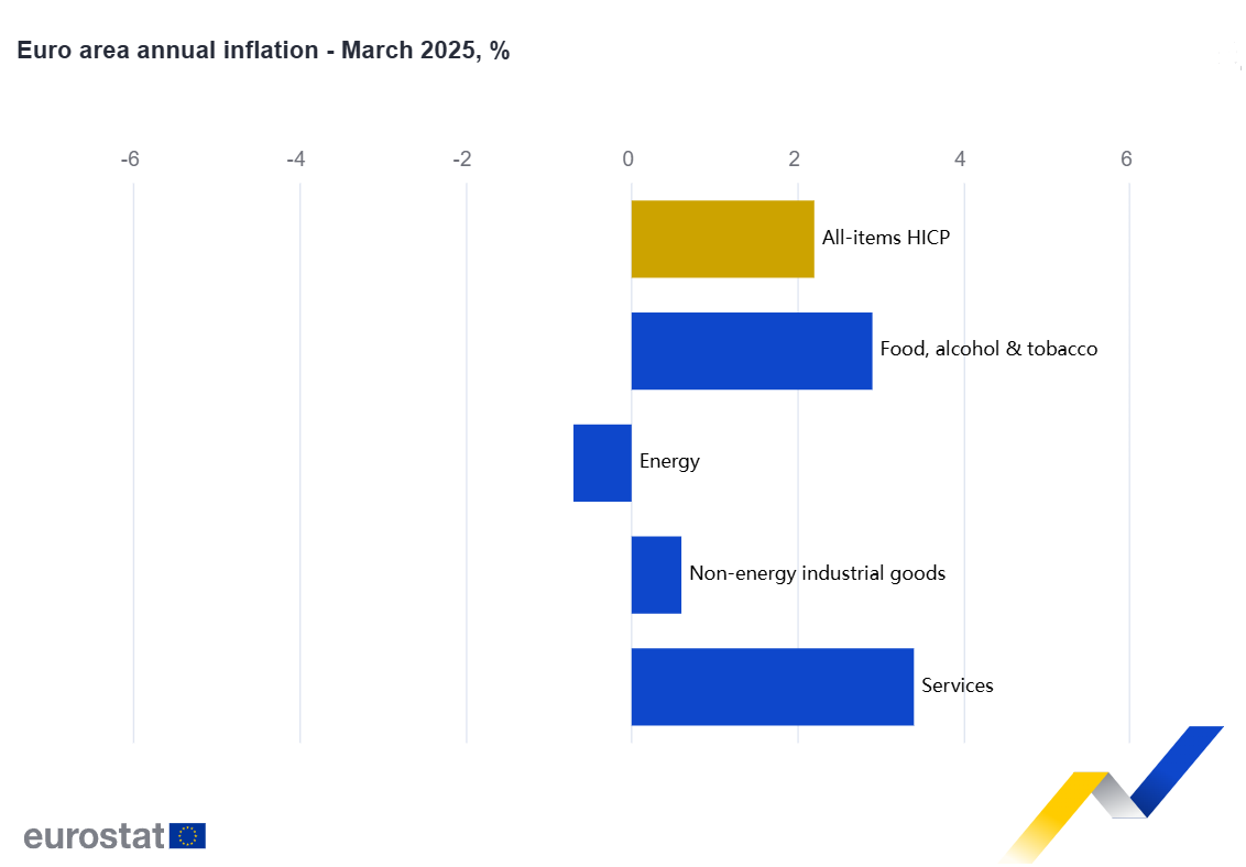 Στο 2,2% αναμένεται να διαμορφωθεί τον Μάρτιο του 2025 ο ετήσιος πληθωρισμός της ευρωζώνης -από 2,3% τον Φεβρουάριο- σύμφωνα με προκαταρκτική εκτίμηση της Eurostat, της στατιστικής υπηρεσίας της Ευρωπαϊκής Ένωσης.