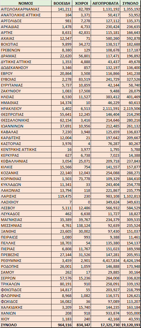Αναλύοντας λίγο τα επιμέρους στοιχεία όπως αυτά απεικονίζονται στον παρακάτω πίνακα, προκύπτει πως πρώτος Νομός της χώρας βάσει ζωικού κεφαλαίου, είναι ο Νομός Ρεθύμνης με 4.424.194 ζώα, ακολουθούμενος από τον Νομό Ηρακλείου με 2.119.506 ζώα, κάτι που δείχνει τη «δύναμη» της Κρήτης στην κτηνοτροφία.