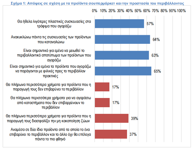 Όπως φαίνεται στο σχήμα, το οποίο αποτυπώνει τις στάσεις των καταναλωτών αναφορικά με την περιβαλλοντική τους συνείδηση και τις καταναλωτικές τους επιλογές, όπως αυτές σχετίζονται με την παραγωγή προϊόντων, τη συσκευασία και τη λιανική πώληση, με 2 στους 3 περίπου καταναλωτές να θεωρούν σημαντικά τα θέματα περιβάλλοντος. Καταγράφεται προτίμηση για πρακτικές με μειωμένο περιβαλλοντικό αποτύπωμα, όπως η επιθυμία για λιγότερες πλαστικές συσκευασίες στα τρόφιμα (57%), επιθυμία για μείωση των περιβαλλοντικών επιπτώσεων των προϊόντων που επιλέγουν (63%) και επιθυμία τα προϊόντα να παράγονται με φιλικές προς το περιβάλλον πρακτικές (65%).