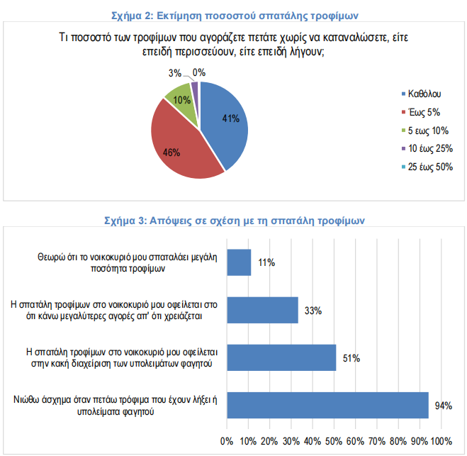Όπως φαίνεται στο σχήμα 3, μόλις το 11% θεωρεί ότι το νοικοκυριό του σπαταλά μεγάλη ποσότητα τροφίμων, ενώ η απόρριψη τροφίμων κρίνεται ενοχικά σχεδόν από το σύνολο του κοινού (94%). Όσον αφορά τα αίτια της σπατάλης, ένα σημαντικό ποσοστό 51% αποδίδει τη σπατάλη στην κακή διαχείριση των υπολειμμάτων φαγητού, ενώ το 33% δηλώνει ότι αγοράζει περισσότερα απ’ όσα χρειάζεται.