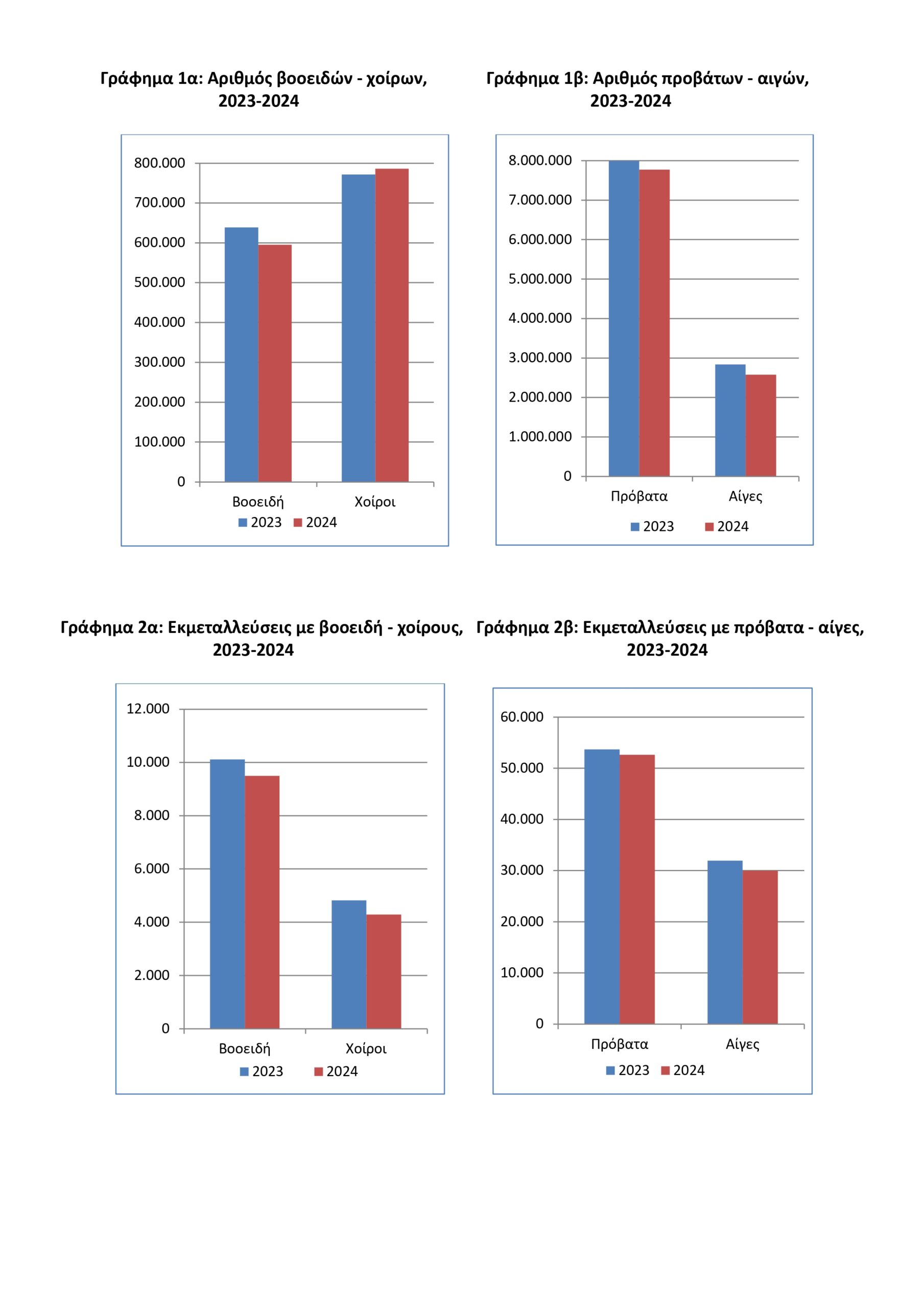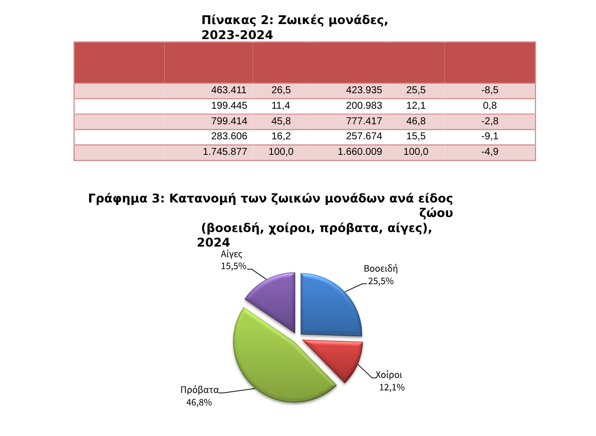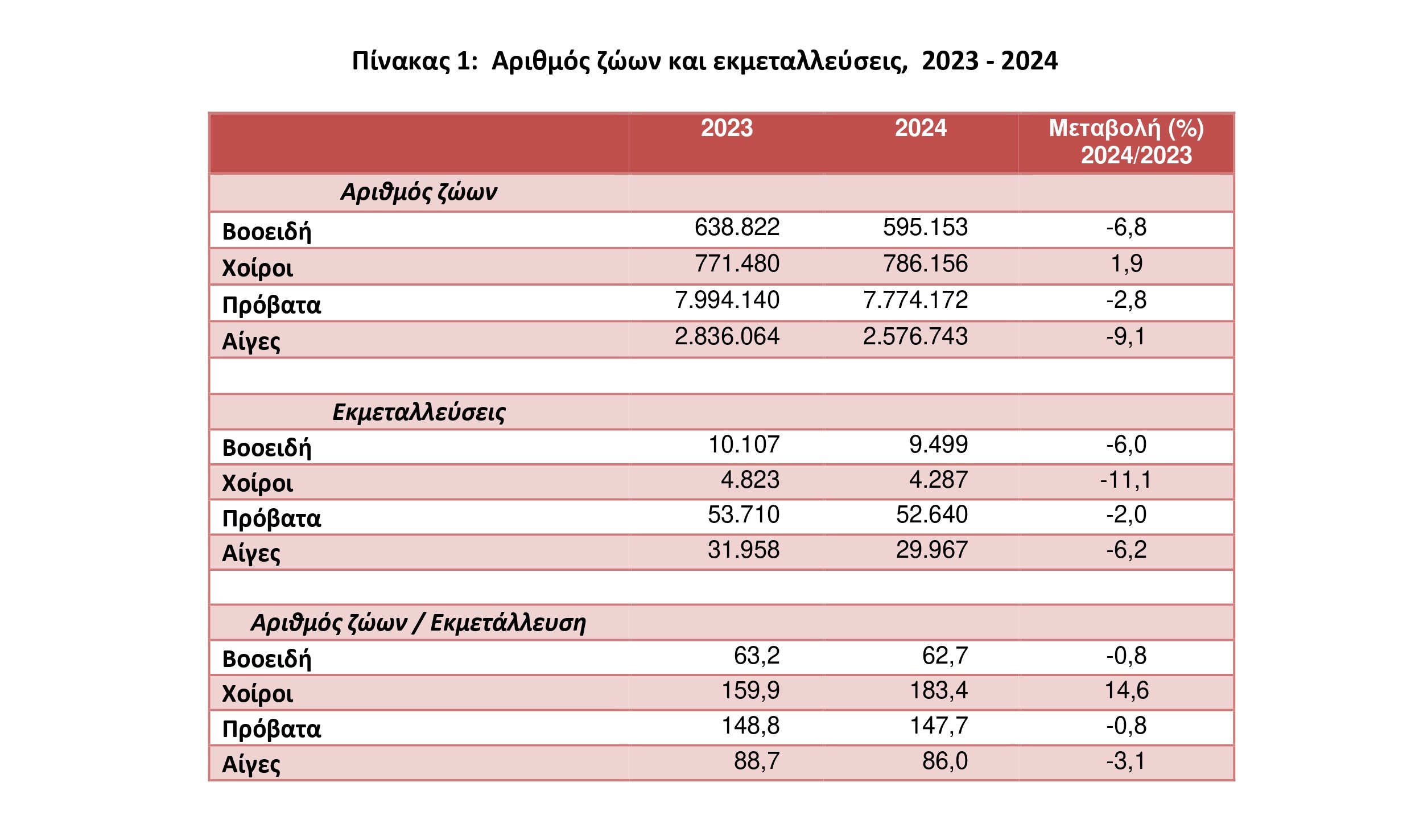 Το σύνολο του ζωικού κεφαλαίου (βοοειδή, χοίροι, πρόβατα, αίγες) εκφρασμένο σε ζωικές μονάδες (ΖΜ) παρουσίασε μείωση 4,9% το 2024 σε σχέση με το 2023.